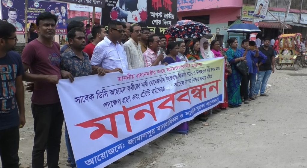 জামালপুরের সাবেক জেলা প্রশাসক আহমেদ কবীরের নারী কেলেঙ্কারীর ঘটনায় দোষীদের দৃষ্টান্তমূলক শাস্তির দাবিতে জামালপুরে মানববন্ধন অনুষ্ঠিত হয়েছে।