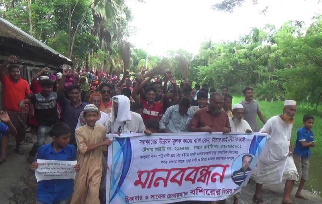 সরকারি উন্নয়ন কাজে বাধা প্রদান, ১০ লক্ষ টাকা চাদা দাবি ও বিভিন্ন হুমকি ধামকি প্রদানের প্রতিবাদে ঝাড়ু মিছিল, মানববন্ধন ও সংবাদ সম্মেলন করেছে এলাকাবাসী। বরিশাল বিভাগ পল্লী অবকাঠামো উন্নয়ন শীর্ষক প্রকল্পের আওতায় পটুয়াখালী সদর উপজেলার মরিচবুনিয়া ইউনিয়নের পাটুখালী সরকারি প্রাথমিক বিদ্যালয় থেকে আছমত আলী জুনিয়ার মাধ্যমিক বিদ্যালয় পর্যন্ত রাস্তা পাকা করণ কাজে ঠিকাদারী প্রতিষ্ঠানকে স্থানীয় বশির উদ্দিন সিকদার বাধা প্রদান করছেন বলে অভিযোগ করা হয়।