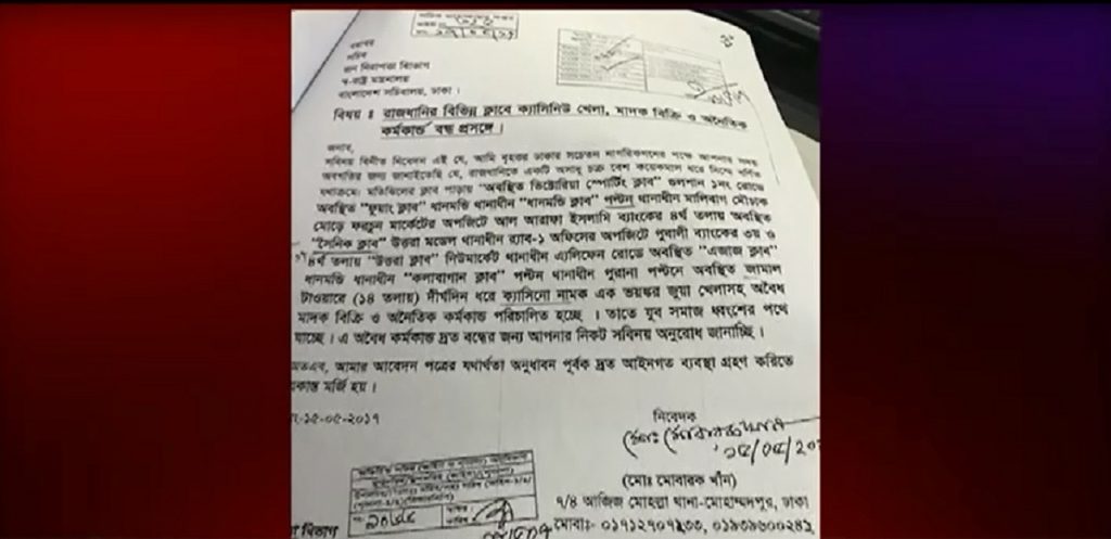 প্রায় আড়াই বছর আগে ২০১৭ সালের মে মাসে, স্বরাষ্ট্র মন্ত্রণালয়ে, মোবারক খান নামে একজন এনিয়ে অভিযোগ করেন। অভিযোগে বলা হয়, মতিঝিল, পল্টন, ফকিরাপুল, বনানী, উত্তরা, কলাবাগানের বিভিন্ন ক্লাবে চলে কোটি কোটি টাকার জুয়ার আসর। সেসব আসরে সেই সময়েই যোগ হয় ক্যাসিনোর সরঞ্জাম। এসব তথ্য জানানো হয় লিখিত অভিযোগে। তখন সেই অভিযোগ, পুলিশ সদর দফতরকে লিখিতভাবে জানায় মন্ত্রণালয়। পুলিশ সদর দফতর এই বিষয়টি দেখতে বলে ডিএমপিকে। পুলিশ তখন, পল্টনের জামান টাওয়ারের জুয়ার আসর বন্ধ করে। বাকি ক্লাবে ক্যাসিনো থেকে যায় রমরমা। যদিও পুলিশের দাবি, তারা অভিযোগ পেলেই ব্যবস্থা নিয়েছে।