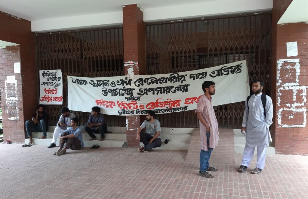 উপাচার্য অপসারণ দাবিতে দ্বিতীয় দিনের মত ধর্মঘট ও প্রশাসনিক ভবন অবরোধ কর্মসূচি পালন করছে জাহাঙ্গীরনগর বিশ্ববিদ্যালয়ের শিক্ষার্থী ও শিক্ষকদের একাংশ।