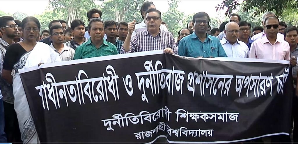 প্রশাসনে থাকা দুর্নীতিবাজদের অবিলম্বে অপসারণের দাবি জানান বক্তারা। পূজার ছুটির পর লাগাতার কর্মসূচির হুঁশিয়ারি দেন তারা। রাজশাহী বিশ্ববিদ্যালয়ের উপচার্যের জয় হিন্দ বলা ও উপ উপচার্যের নিয়োগ সংক্রান্ত একটি অডিও ফাঁসের পর আন্দোলন কর্মসূচি ঘোষণা করে শিক্ষার্থী ও শিক্ষকদের একাংশ।