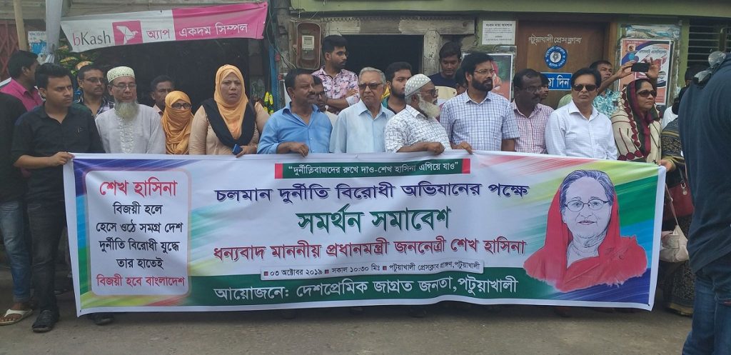 ‘দুর্নীতিবাজদের রুখে দাও-শেখ হাসিনা এগিয়ে যাও’ এই শ্লোগানকে সামনে রেখে দেশপ্রেমিক জাগ্রত জনতার ব্যানারে সরকারের চলমান দুর্নীতি বিরোধী অভিযানকে সমর্থন জানিয়ে পটুয়াখালীতে দুর্নীতি বিরোধী সমর্থন সমাবেশ অনুষ্ঠিত হয়েছে। বৃহস্পতিবার সকালে পটুয়াখালী প্রেসক্লাবের সামনে এ সমাবেশ অনুষ্ঠিত হয়।
