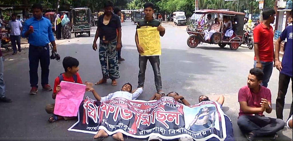বুয়েট শিক্ষার্থী আবরার হত্যার প্রতিবাদসহ ৫ দফা দাবিতে বিক্ষোভ মিছিল ও সড়ক অবরোধ করেছে রাজশাহী বিশ্ববিদ্যালয়ের শিক্ষার্থীরা। মঙ্গলবার সাড়ে এগারটায় বিশ্ববিদ্যালয়ের গ্রন্থাগারের সামনে শিক্ষার্থীরা বিক্ষোভ মিছিল শুরু করে। মিছিলটি ক্যাম্পাস প্রদিক্ষণ শেষে প্রধান ফটকের সামনে ঢাকা-রাজশাহী মহাসড়ক অবরোধ করে। এসময় পুলিশের সাথে বাদানুবাদ হয় শিক্ষার্থীদের। ঘন্টাখানেক অবরোধ শেষে সন্ধ্যায় ক্যাম্পাসে মশাল মিছিলের ঘোষণা দিয়ে অবরোধ তুলে নেয়।