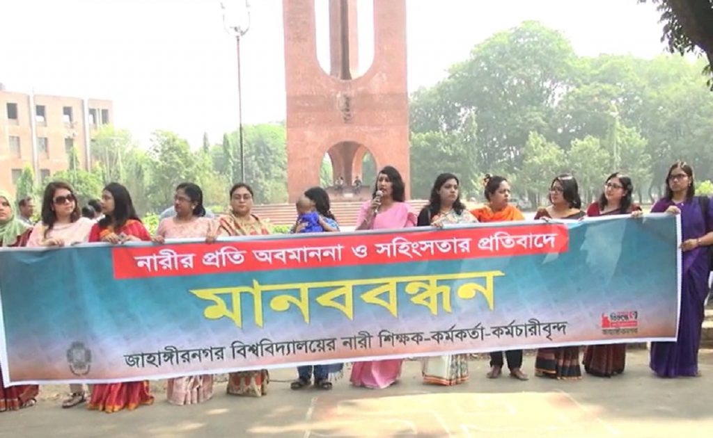 নারীর প্রতি অবমাননা ও সহিংসতার প্রতিবাদে মানববন্ধন ও সংবাদ সম্মেলন করেছে জাহাঙ্গীরনগর বিশ্ববিদ্যালয়ের নারী শিক্ষক-কর্মকর্তা-কর্মচারীবৃন্দ। মঙ্গলবার সকালে ‘অন্যায়ের বিরুদ্ধে ও উন্নয়নের পক্ষে জাহাঙ্গীরনগর’ এর ব্যানারে শহীদ মিনারের পাদদেশের সামনে এই কর্মসূচি পালন করছে তারা।
