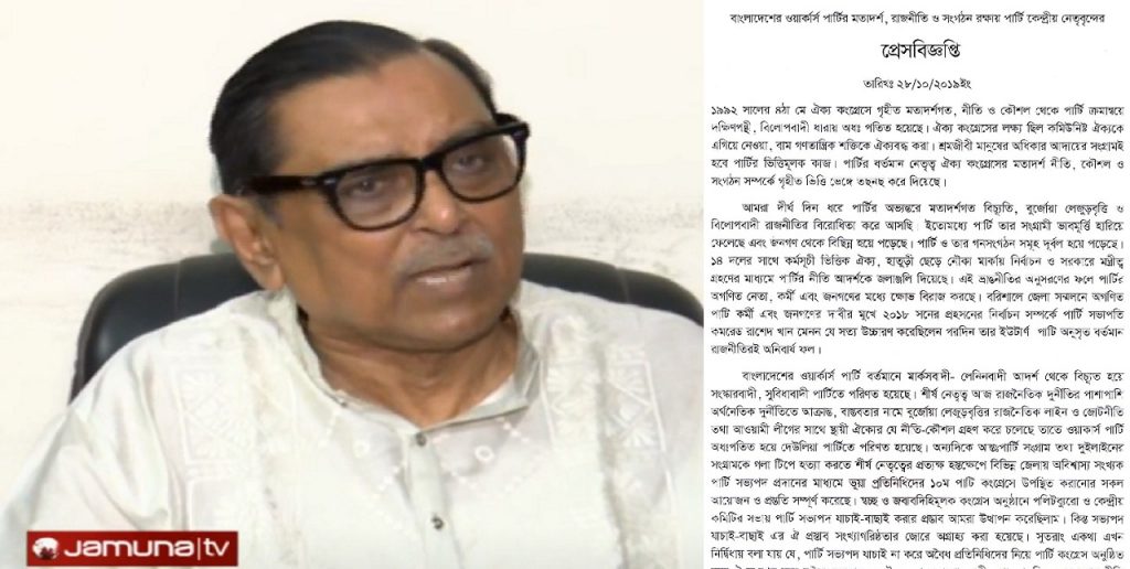 এর আগে মতানৈক্যের কারণে গত ২২ অক্টোবর ওয়ার্কার্স পার্টি ছাড়ার ঘোষণা দিয়েছেন সাবেক সাধারণ সম্পাদক ও পলিটব্যুরোর সদস্য বিমল বিশ্বাস। পরে লিখিত বক্তব্যের জন্য উল্টো তাকেই দল থেকে বহিষ্কার করা হয়।