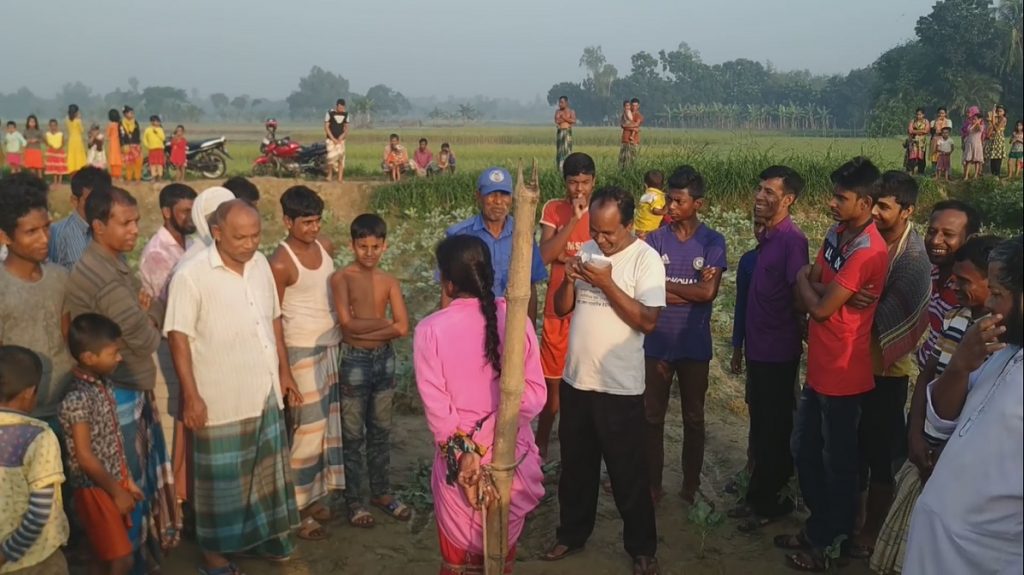 নির্যাতনের শিকার শিল্পী বেগম জানান, আগের স্বামীর সঙ্গে বিয়ে-বিচ্ছেদের পর ৮/৯ মাস আগে উপজেলার অনন্তবালা গ্রামের শহীদুল ইসলামের ছেলে রাফি তাকে বিয়ে করেন। বিয়ের পর তারা সদর উপজেলার ঠেঙামারা এলাকার একটি ভাড়া বাড়িতে থাকতেন। মাসখানেক ধরে স্বামীর কোনো খোঁজ না পাওয়ায় শুক্রবার সকালে তিনি অনন্তবালা গ্রামে শ্বশুরবাড়িতে গেলে তার স্বামী ও তার পরিবারের সদস্যরা বাড়ির সামনে থাকা বাঁধাকপি ক্ষেতের মধ্যে খুঁটি গেড়ে তাকে বেঁধে ফেলেন। পরে তারা তাকে কয়েক ঘণ্টা ধরে নির্যাতন চালান। একপর্যায়ে তারা তাকে বাঁধাকপির ক্ষেত নষ্টের অভিযোগে গ্রাম পুলিশের মাধ্যমে উপজেলা নির্বাহী কর্মকর্তার কার্যালয়ে পাঠায়। উপজেলা নির্বাহী কর্মকর্তা আলমগীর হোসেন শিল্পীর কাছে মূল ঘটনা জানার পর থানায় মামলা দায়েরের পরামর্শ দেন।