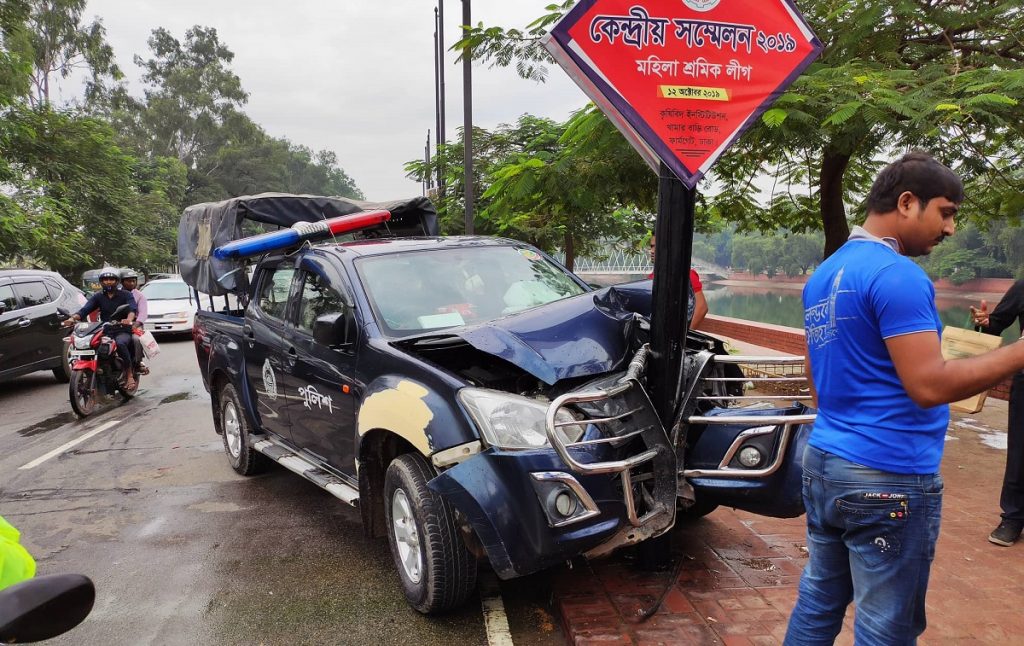 পুলিশের ভাষ্য মতে, হঠাৎ করা ইউটার্ন নেয়া মোটর সাইকেলকে সেভ করতে গিয়ে নিয়ন্ত্রণ হারিয়ে পুলিশের গাড়িটি পিলারের সাথে সজোড়ে ধাক্কা খায়।