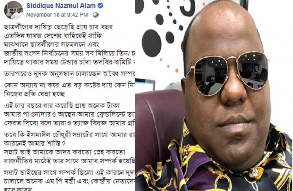 তিনি বলেন, ‘আমার বিরুদ্ধে অনুসন্ধান চালালে অনেক এমপি-মন্ত্রীর যাবজ্জীবন হবে।’ তারা সবাই ধোয়া তুলসিপাতা নয় বলে তীর নিক্ষেপও করলেন। গত ১৮ নভেম্বর নিজের ভেরিফায়েড ফেসবুক অ্যাকাউন্টে এসব মন্তব্য লেখেন সিদ্দিকী নাজমুল আলম।