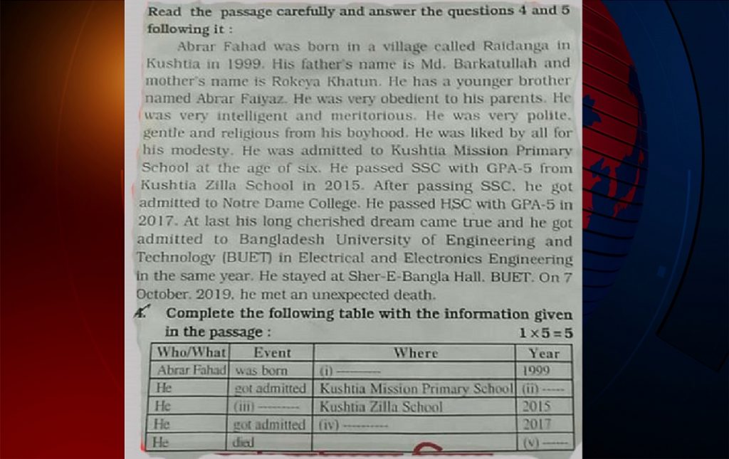 মতিঝিল আইডিয়াল স্কুল অ্যান্ড কলেজের সপ্তম শ্রেণির বার্ষিক পরীক্ষার ইংরেজি প্রশ্নপত্র করা হয়েছে আবরার ফাহাদকে নিয়ে। এতে আবরারের ওপর একটি প্যাসেজ দিয়ে সে আলোকে প্রশ্নের উত্তর দিতে বলা হয়েছে।