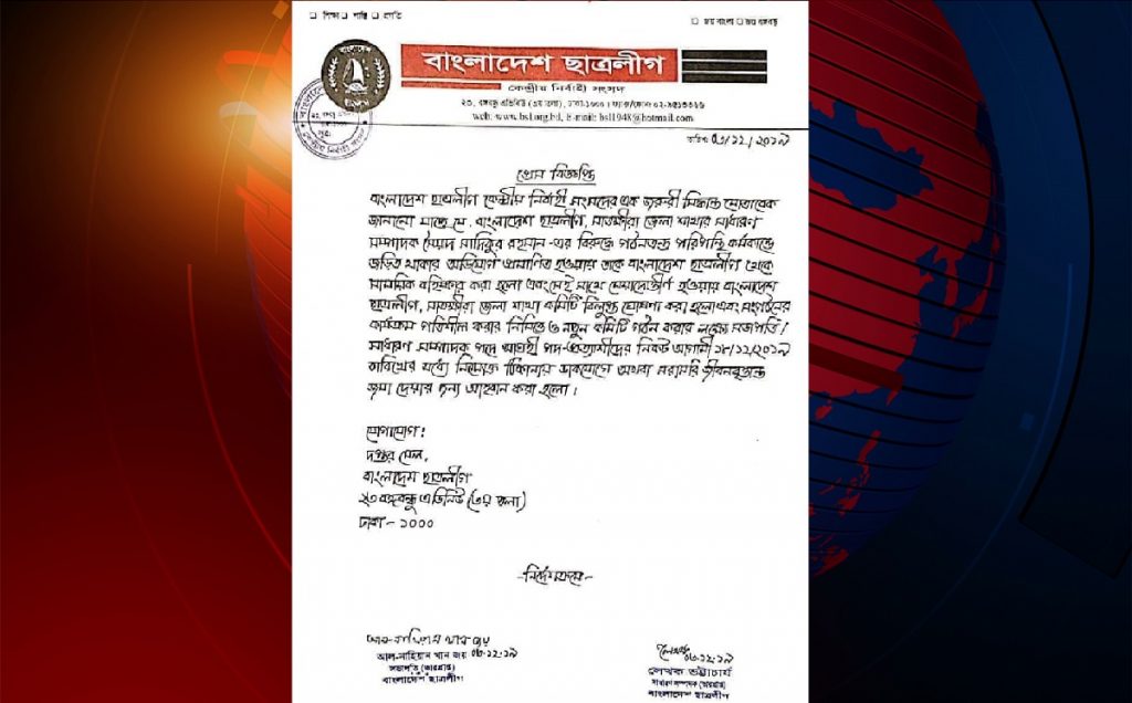 বাংলাদেশ ছাত্রলীগ কেন্দ্রীয় কার্যকরী সংসদের ভারপ্রাপ্ত সভাপতি আল নাহিয়ান খান জয় ও ভারপ্রাপ্ত সাধারণ সম্পাদক লেখক ভট্টাচার্য স্বাক্ষরিত এক প্রেস বিজ্ঞপ্তিতে এ তথ্য জানানো হয়েছে। একই সাথে নতুন কমিটি গঠনের লক্ষ্যে সভাপতি সাধারণ সম্পাদক পদে আগ্রহীদের আগামী ১৮ ডিসেম্বর ২০১৯ তারিখের মধ্যে সংগঠনের দপ্তর সেল বরাবর জীবনবৃত্তান্ত পাঠানোর জন্য অনুরোধ জানানো হয়েছে।
