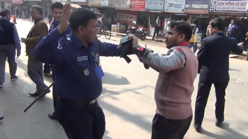 প্রকাশ্যে রাস্তায় ডিএসবির কনস্টেবল আবুল বাশারকে পেটালেন মৌলভীবাজার মডেল থানার ওসি আলমগীর হোসেন।