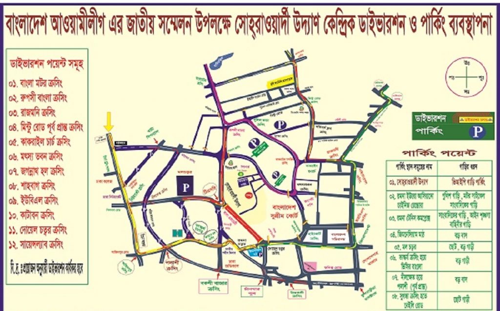 ক) সোহরাওয়ার্দী উদ্যানে বাংলাদেশ আওয়ামী লীগের জাতীয় সম্মেলন উপলক্ষে রাজশাহী, খুলনা ও রংপুর বিভাগ সমূহের গাড়ি গাবতলী-টেকনিক্যাল-শ্যামলী-আসাদগেট-ধানমন্ডি ৩২-সাইন্সল্যাব-নিউমার্কেট-নীলক্ষেত-ঢাকা বিশ্ববিদ্যালয়ের গেট হয়ে জিমনেশিয়াম মাঠে পার্কিং করবে।