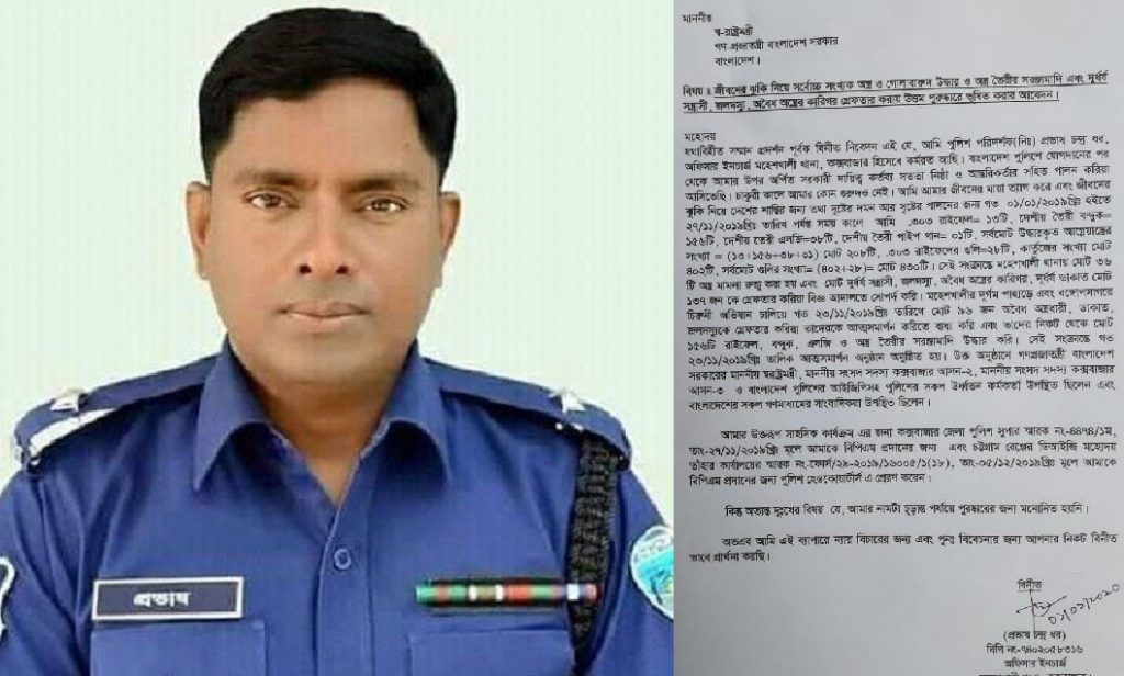 চিঠিতে ওসি প্রভাষ চন্দ্র ধর সততা ও নিষ্ঠার সাথে দায়িত্ব পালনের কথা উল্লেখ করে অবৈধ অস্ত্র উদ্ধার ও জলদস্যু আত্মসমর্পনে তার ভূমিকার কথা তুলে ধরেন।