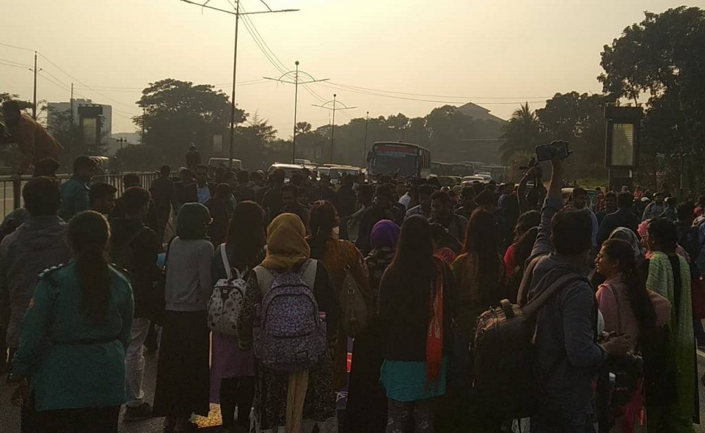ঘটনাস্থলে পৌঁছে প্রথমে মানববন্ধন করেন ঢাবি শিক্ষার্থীরা। পরে পৌনে ৪টার দিকে তারা সড়ক অবরোধ করে স্লোগান দিতে থাকেন। এতে বিমানবন্দর সড়কের দু’পাশে যান চলাচল বন্ধ হয়ে যায়।