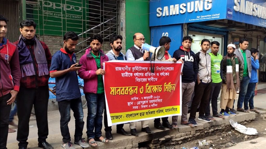 ঢাকা বিশ্ববিদ্যালয়ের শিক্ষার্থী ধর্ষণের ঘটনার প্রতিবাদে মানববন্ধন হয়েছে ময়মনসিংহে। বাংলাদেশ ছাত্র অধিকার পরিষদ ময়মনসিংহের উদ্যোগে দুপুরে ময়মনসিংহ প্রেসক্লাবের সামনে মানববন্ধনটি অনুষ্ঠিত হয়।