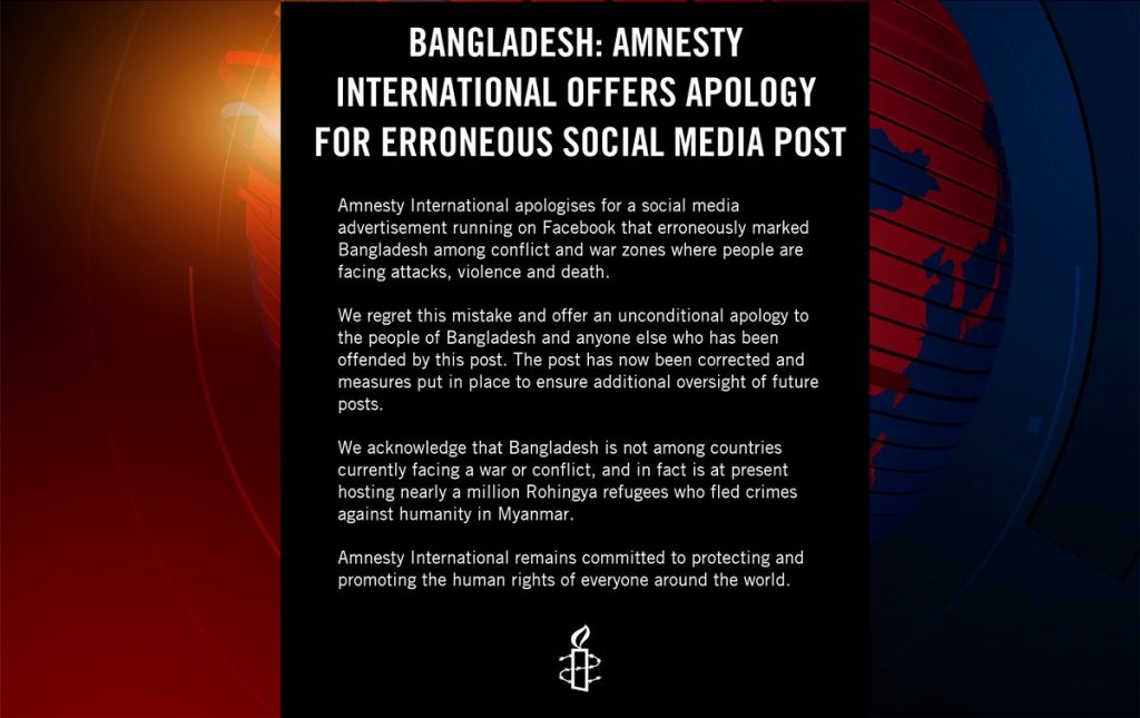 ফেসবুকে দেয়া নতুন পোস্টে বলা হয়, ‘সংঘাত ও যুদ্ধময় দেশ, যেখানে মানুষ আক্রমণ, সংঘাত ও মৃত্যুর মুখোমুখি হচ্ছে ফেসবুক বিজ্ঞাপনে বাংলাদেশকে অন্তর্ভুক্ত করায় ক্ষমা চাচ্ছে অ্যামনেস্টি ইন্টারন্যাশনাল। আমরা এই ভুলের জন্য বাংলাদেশের জনগণের এবং যারা এর মাধ্যমে মর্মাহত হয়েছেন, তাদের কাছে নিঃশর্ত ক্ষমা চাচ্ছি।’
