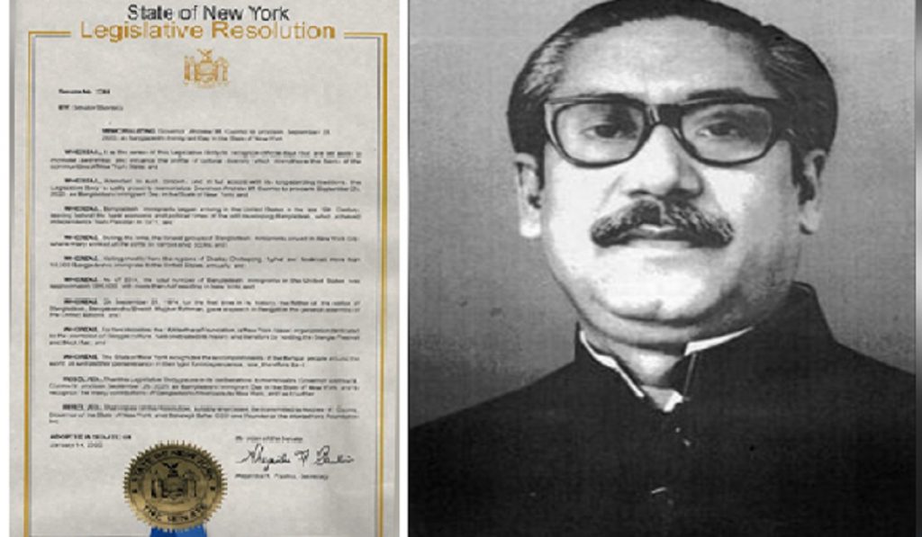 বাঙালি জাতির জনক বঙ্গবন্ধু শেখ মুজিবুর রহমানের জন্মশতবার্ষিকীতে সম্মাননা জানাল নিউইয়র্ক স্টেট।
