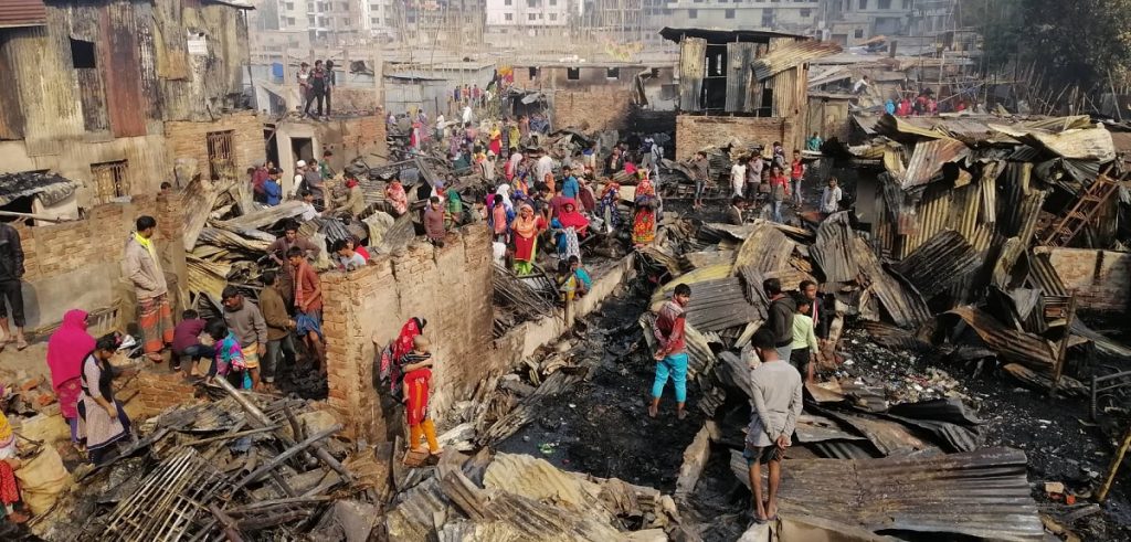 প্রত্যক্ষদর্শীরা জানায়, ভোর চারটার দিকে একটি বাসা থেকে আগুনের সুত্রপাত হলে মুহুর্তে আগুন চারদিকে ছড়িয়ে পড়ে। অগ্নিকাণ্ডের ঘটনায় দেড় শতাধিক বাড়ির পাঁচ শতাধিক মানুষ ক্ষতিগ্রস্ত হয়েছে। স্থানীয় জনপ্রতিধিরা ক্ষতিগ্রস্তদের পাশ্ববর্তী বঙ্গবন্ধু বিদ্যা নিকেতন মাঠে অস্থায়ীভাবে আশ্রয়ের ব্যবস্থা করেছেন।