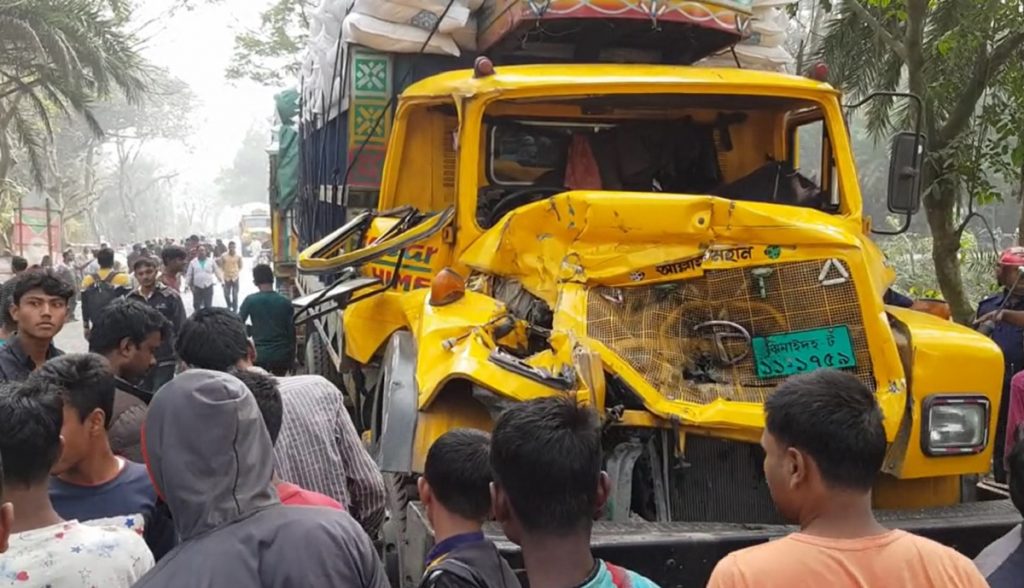 ঝিনাইদহের কালীগঞ্জে তিন ট্রাকে মুখোমুখি সংঘর্ষের ঘটনায় পাঁচজন আহত হয়েছেন। সোমবার দুপুর একটার দিকে কালীগঞ্জ যশোর মহাসড়কের রগুনাথপুর নামক স্থানে এঘটনা ঘটে। নোয়াপাড়া থেকে কয়লা ভর্তি একটি ট্রাক বগুড়ার উদ্দেশ্যে ছেড়ে আসে অপরদিক থেকে কুষ্টিয়া থেকে ছেড়ে আসা বালি বোঝায় ট্রাক বারবাজার রগুনাথপুর নামক স্থানে মুখোমুখি সংঘর্ষ হয় এমন সময় পেছন থেকে আরেকটি ট্রাক এসে ধাক্কা দেয়। এতে তিন ট্রাকের চালক ও হেলপার আহত হয়।