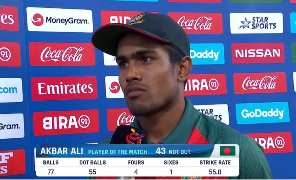 শেষ দিকে ধারাভাষ্যকারের অনুমতি নিয়ে বাংলাদেশি দর্শকদের উদ্দেশে বাংলা ভাষায় বক্তব্য দেন আকবর আলী। বাংলাদেশের অগণিত দর্শকদের উদ্দেশে বাংলায় বলে উঠলেন, আমি দর্শকদের প্রতি কৃতজ্ঞতা জানাই। আপনারা দ্বাদশ খেলোয়াড় হিসেবে আমাদের সঙ্গে ছিলেন।