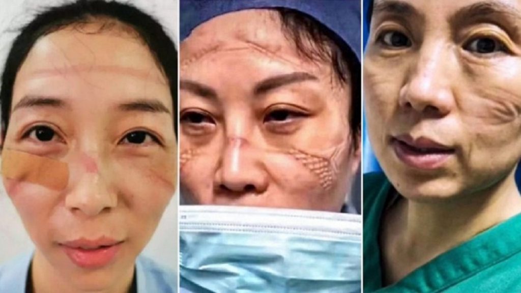 সেখানে দেখা যাচ্ছে, দীর্ঘ সময় মাস্ক পরে থাকার কারণে মুখের ওপর দাগ বসে গেছে। এক নার্সের চোখের নিচে একটি ব্যান্ডেজও দেখা যাচ্ছে।