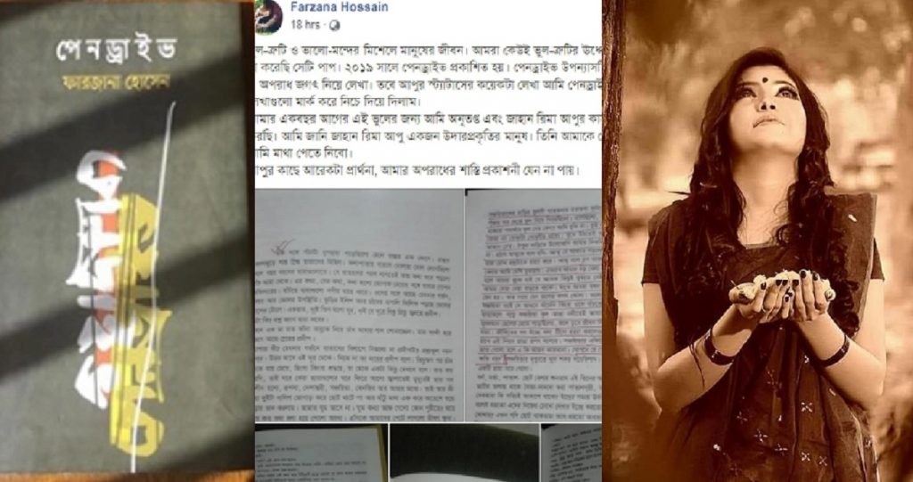 এদিকে, নিন্দা ও সমালোচনার মুখে ফারজানা হোসাইন সোশ্যাল মিডিয়ায় পোস্ট দিয়ে তার কৃতকর্মের জন্য ক্ষমা চেয়েছেন। লিখেছেন, ভুল-ত্রুটি ও ভালো-মন্দের মিশেলে মানুষের জীবন। আমরা কেউই ভুল-ত্রুটির ঊর্ধ্বে নয়। তবে আমি যা করেছি সেটি পাপ। ২০১৯ সালে পেনড্রাইভ প্রকাশিত হয়। পেনড্রাইভ উপন্যাসটি সম্পূর্ণ রাজনীতি ও অপরাধ জগৎ নিয়ে লেখা। তবে আপুর স্ট্যাটাসের কয়েকটা লেখা আমি পেনড্রাইভ এ যুক্ত করি। লেখাগুলো মার্ক করে নিচে দিয়ে দিলাম।