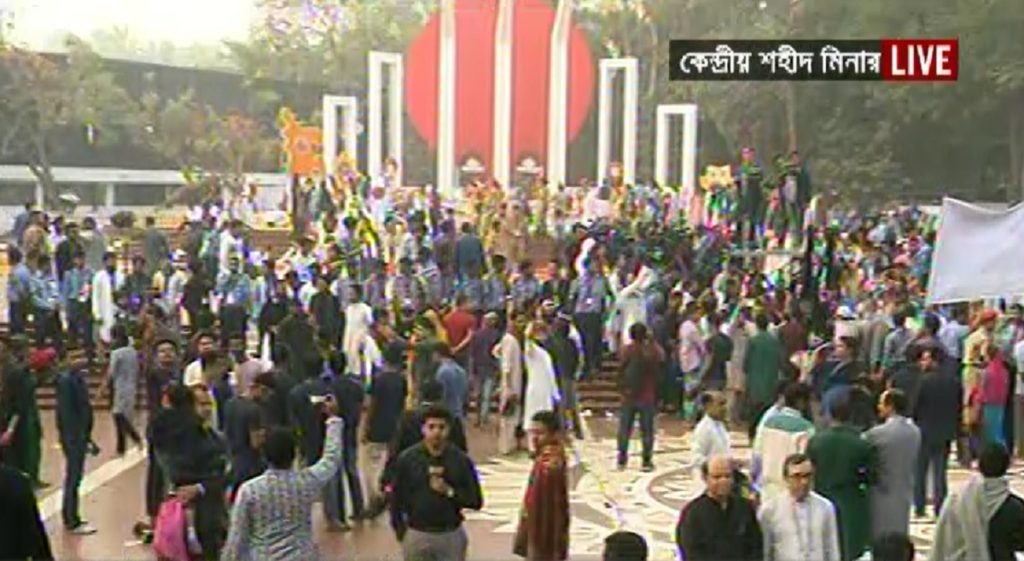 একুশের ভোর থেকে ভাষা শহীদদের শ্রদ্ধা জানাতে কেন্দ্রীয় শহীদ মিনারে ঢল নেমেছে লাখো মানুষের। ভোরের আলো ফোটার সঙ্গে সঙ্গেই হাতে ফুল নিয়ে জাতির শ্রেষ্ঠ সন্তানদের স্মরণ করতে শহীদ মিনারে আসছেন বিভিন্ন বয়সের মানুষ। শ্রদ্ধা জানাতে কালো পোশাক আর খালি পায়ে ভাষার অহংকার বুকে নিয়ে ধীরে ধীরে শহীদ বেদির দিকে এগিয়ে যাচ্ছে শিশু- কিশোর, যুবক-যুবতি ও বয়োবৃদ্ধরা। সারিবদ্ধভাবে বেদিতে ফুল দিয়ে শ্রদ্ধা জানাচ্ছে বিভিন্ন রাজনৈতিক, সামাজিক ও সাংস্কৃতিক সংগঠন। বিভিন্ন শিক্ষা প্রতিষ্ঠানের শিক্ষার্থীরাও আসছে ভাষা শহীদদের প্রতি বিনম্র শ্রদ্ধা জানাতে।