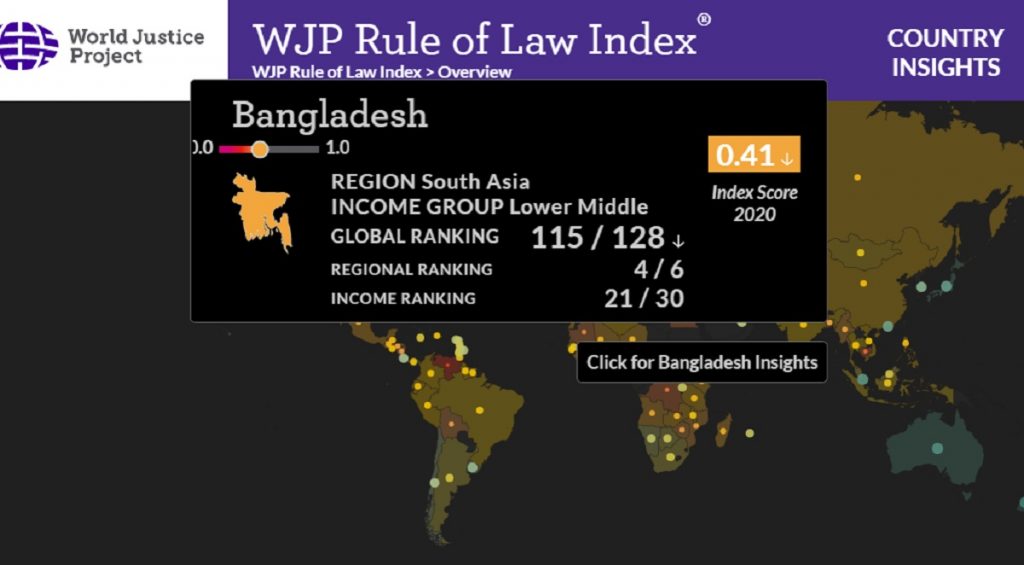 গত এক বছরে আইনের শাসন সূচকে অবনতি হয়েছে বাংলাদেশের। বিশ্বের ১২৮টি দেশের মধ্যে বাংলাদেশের অবস্থান ১১৫-তম। আর দক্ষিণ এশিয়ার ছয়টি দেশের মধ্যে বাংলাদেশের অবস্থান চতুর্থ। যুক্তরাষ্ট্রভিত্তিক আন্তর্জাতিক সংস্থা দ্য ওয়ার্ল্ড জাস্টিস প্রজেক্টের (ডব্লিউজেপি) ‘আইনের শাসন সূচক প্রতিবেদন ২০২০’–এ এই চিত্র উঠে এসেছে। বুধবার এ প্রতিবেদনটি প্রকাশ করা হয়।