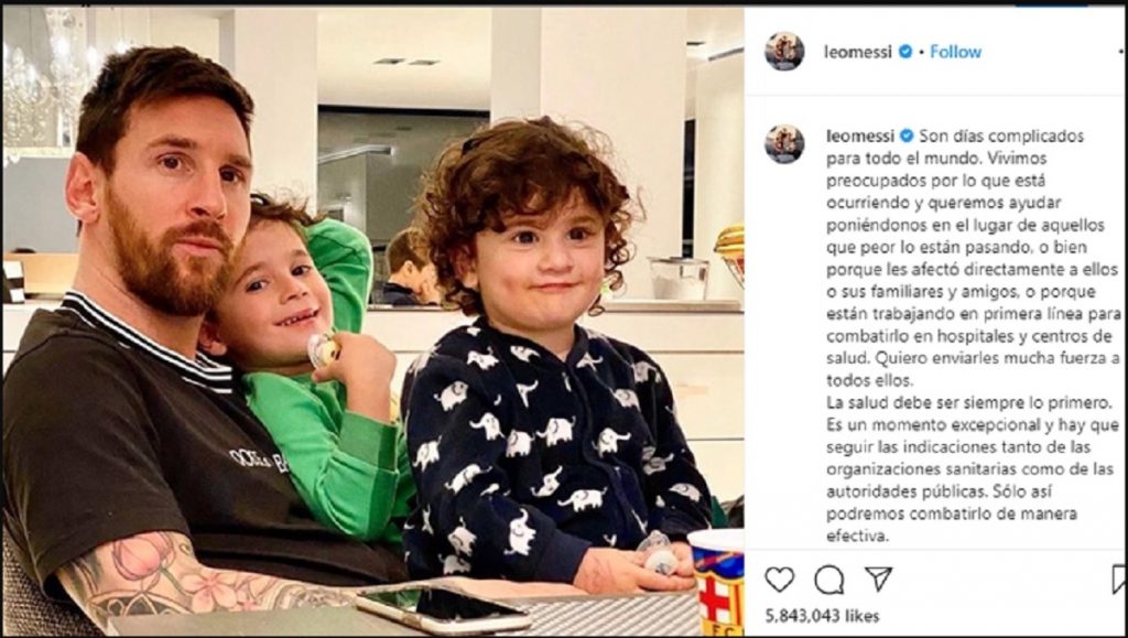 মেসি আরও লেখেন, ‘আমি মনে করি, সবার আগে স্বাস্থ্য, তার পর অন্য কিছু প্রাধান্য পাক। কিন্তু এখন স্বাস্থ্য নিয়ে শঙ্কিত সবাই। একটা অন্যরকম সময় চলছে। আমাদের সবাইকে অবশ্যই স্বাস্থ্য সংস্থা এবং স্থানীয় প্রশাসনের নির্দেশনা মেনে চলা উচিত। আর এভাবেই আমরা বর্তমান সংকটময় পরিস্থিতির সঙ্গে লড়তে পারব। এখনই সময় এসেছে দায়িত্ববান হওয়ার।