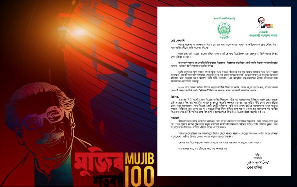 মুজিববর্ষ উপলক্ষে কোমলমতি শিক্ষার্থীদের উদ্দেশে লিখেন বঙ্গবন্ধুকন্যা প্রধানমন্ত্রী শেখ হাসিনা। চিঠিতে তিনি শিশুদের প্রতি শুভেচ্ছা ও ভালোবাসা জানান। তাদের বাবা-মায়ের প্রতি সালাম ও ভাইবোনদের প্রতি স্নেহ পৌঁছে দিতে অনুরোধ করেছেন। একইসাথে পাড়া-প্রতিবেশীদের প্রতিও শুভেচ্ছা জানাতে অনুরোধ করেছেন। চিঠিতে তিনি বঙ্গবন্ধুর জন্ম, রাজনৈতিক জীবন ও স্বপ্ন নিয়ে শিশুদের ধারণা দেন।