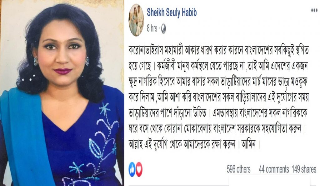 ফেসবুক স্ট্যাটসে তিনি বলেন- ‘করোনাভাইরাস মহামারী আকার ধারণ করার কারণে বাংলাদেশের সবকিছুই স্থগিত হয়ে গেছে। কর্মজীবী মানুষ কর্মস্থলে যেতে পারছে না ,তাই আমি এদেশের একজন ক্ষুদ্র নাগরিক হিসেবে আমার বাসার সকল ভাড়াটিয়াদের মার্চ মাসের ভাড়া মওকুফ করে দিলাম ,আমি আশা করি বাংলাদেশের সকল বাড়িয়ালাদের এই দুর্যোগের সময় ভাড়াটিয়াদের পাশে দাঁড়ানো উচিত। এমতাবস্থায় বাংলাদেশের সকল নাগরিককে ঘরে বসে থেকে কোরানা মোকাবেলায় বাংলাদেশ সরকারকে সহযোগিতা করুন । আল্লাহ এই দুর্যোগ থেকে আমাদেরকে রক্ষা করুন। আমিন।’