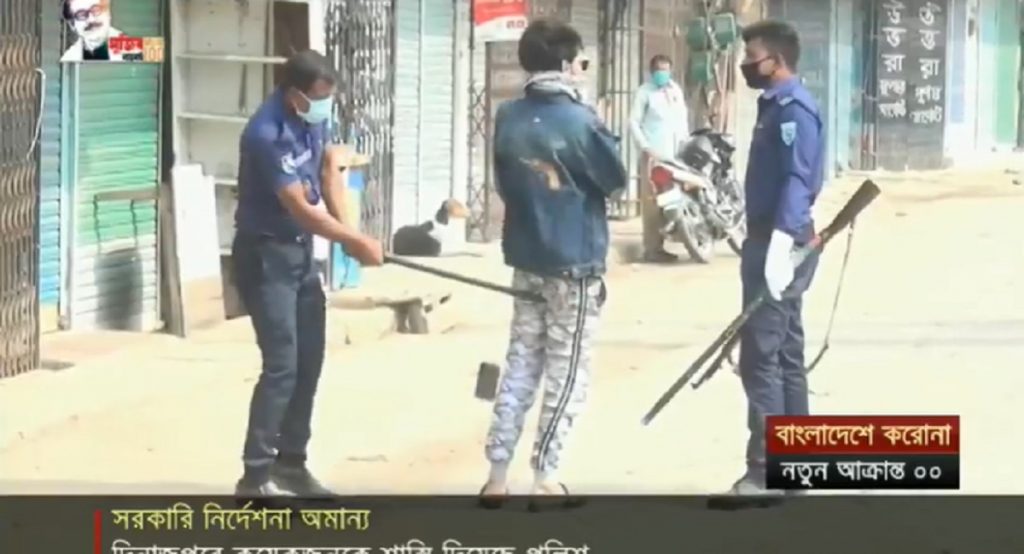 মাস্ক ছাড়া বাইরে বের হওয়ায় দিনাজপুর শহরে কয়েকজনকে পাকড়াও করে পুলিশ। অপ্রয়োজনের ঘোরাফেরার সময় শাস্তি দেয়া হয় একজনকে। লাঠিপেটার শিকার হন বেশ কজন। দিনমজুর আর ভবঘুরেসহ অনেকে পেটের দায়ে বাইরে বের হয়েছিলেন আজ। তাদেরকেও আটক করে আইন শৃঙ্খলা রক্ষা বাহিনী। তবে জরুরি প্রয়োজন ছাড়া ঘর থেকে বের হচ্ছেনা বেশিরভাগ মানুষ।