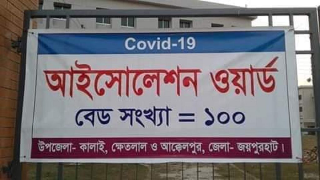 জয়পুরহাটের কালাইয়ের নান্দাইলদীঘিতে করোনাভাইরাসের লক্ষণ দেখা দেয়ায় এক যুবকসহ ওই পরিবারের ৪ জন সদস্যকে আইসোলেশনে রাখা হয়েছে। গতকাল তাদের আক্কেলপুর উপজেলার গোপীনাথপুর হেলথ এন্ড টেকনোলজি ইন্সটিটিউটে আইসোলেশন ইউনিটে ভর্তি করা হয়েছে। একই সঙ্গে ওই পরিবারের সংস্পর্শে আসা ১১ জনকে পরবর্তী সিদ্ধান্ত না দেয়া পর্যন্ত হোম কোয়ারেন্টিনে থাকার নির্দেশ দেয়া হয়েছে।