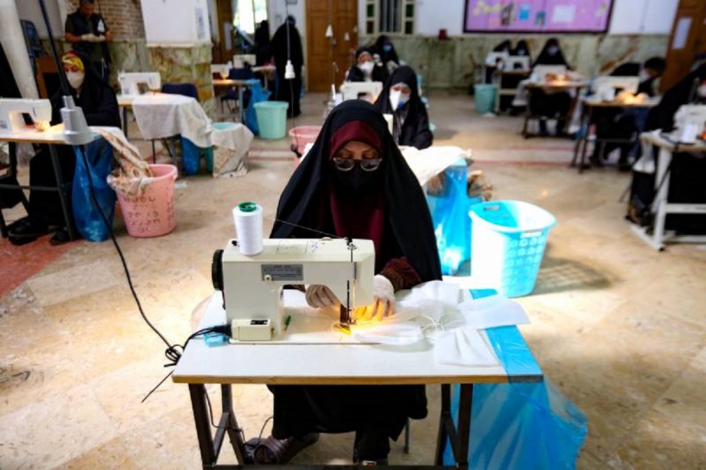 করোনে মোকাবেলায় ইরানের তেহরানের একটি মসজিদে তৈরি হচ্ছে মাস্ক। সুরক্ষার এই জিনিসটি তৈরির কাজে করে যাচ্ছেন স্থানীয় মহিলারাই।
