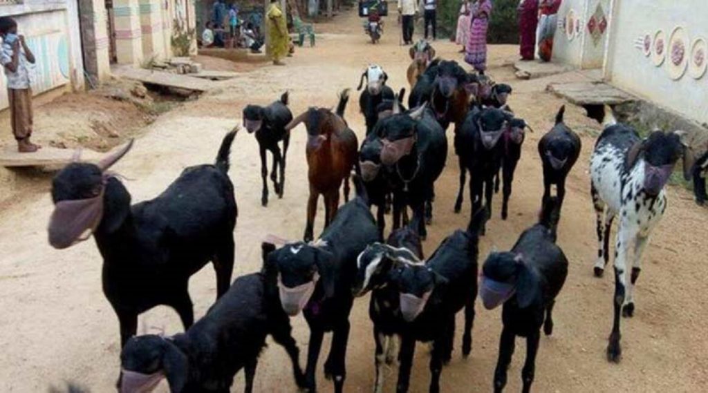 তেলেঙ্গানার কাল্লুর মণ্ডলের বাসিন্দা এ ভেঙ্কটেশ্বর রাওয়ের সংসারের আর্থিক সংস্থানে তাঁর ভরসা ২০টি ছাগলই। লকডাউনে বাড়িতে সাধারণ মানুষ থাকলেও, পশুদের রাখা দায়। ঘাস খেয়ে পেট ভরাতে বাইরে পাঠাতেই হচ্ছে তাদের। কিন্তু ভাইরাস যে তা বোঝে না। তাই তাদের সাবধানে রাখতে ভরসা মাস্ক। সে কারণেই ভেঙ্কটেশ্বর রাও তাঁর গৃহপালিত ছাগলদের মুখ ঢেকেছেন মাস্কে, বাইরে বেরনোর সময় তাদের মুখে পরিয়ে দিচ্ছেন তিনি। ঘাস খেয়ে বাড়ি ফেরার পর নির্দিষ্ট নিয়ম অনুযায়ী মাস্ক ধুয়ে নিচ্ছেন তিনি। তারপর তা ভাল করে রোদে শুকিয়েও নিচ্ছেন।