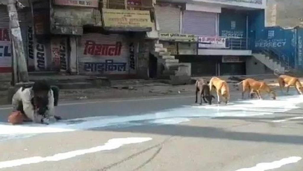 ভারতের আগ্রার রামবাগ চৌরাহায় এই ঘটনা দেখা গেছে। তাজমহল থেকে মাত্র ৬ কিলোমিটার দূরের এক রাস্তায় হঠাৎই উল্টে যায় দুধ বোঝাই গাড়ি। তখন দেখা যায় খিদে মেটাতে পথকুকুরদের সাথে হাতের তালুতে দুধ তুলে খাচ্ছে এক ব্যক্তি। সাথে সাথে একটি পাত্র কিছুটা বাড়ির জন্য নিয়ে যাওয়ার চেষ্টাও করছে।