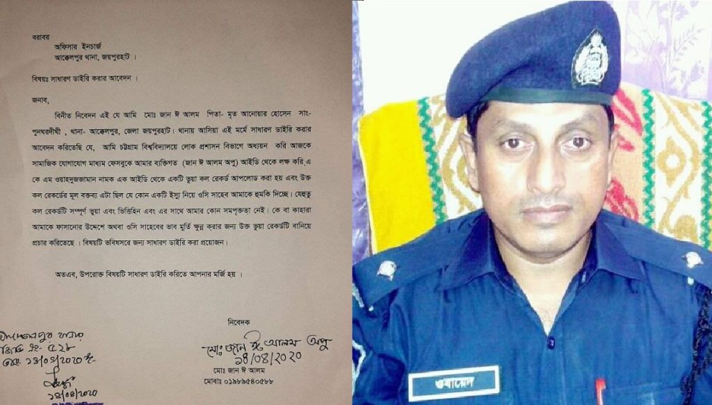 আক্কেলপুর থানার ১৪ এপ্রিলের ৫২৮ নং জিডিতে তিনি উল্লেখ করেছেন, সামাজিক যোগাযোগ মাধ্যম ফেসবুকে আমার ব্যক্তিগত, ‘জান ঈ আলম অপু’ আইডি থেকে লক্ষ্য করি কে এম ওয়াহদুজ্জামান নামক এক আইডি থেকে একটি ভুয়া কল রেকর্ড আপলোড করা হয় এবং উক্ত কল রেকর্ডের মূল বক্তব্য এটা ছিল- যে কোন একটি ইস্যু নিয়ে ওসি সাহেব আমাকে হুমকি দিচ্ছে। যেহেতেু কল রেকর্ডটি সম্পূর্ণ ভুয়া এবং ভিত্তিহীন এবং এর সাথে আমার কোনো সম্পৃক্ততা নেই, কে বা কাহারা আমাকে ফাঁসানোর জন্য অথবা ওসি সাহেবের ভাবমূর্তি ক্ষুন্ন করার জন্য উক্ত ভুয়া রেকর্ডটি বানিয়ে প্রচার করতেছে তাই বিষয়টি সাধারণ ডায়েরি করা প্রয়োজন।