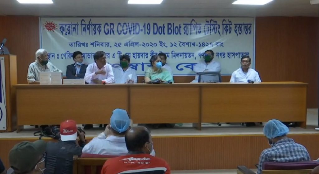 এর আগে গণস্বাস্থ্য কেন্দ্রকে করোনা আক্রান্ত ব্যক্তির রক্তের নমুনা সংগ্রহের অনুমতি দেয় স্বাস্থ্য অধিদপ্তর। পরে করা হয় চূড়ান্ত পরীক্ষা। এরপরেই কিটগুলো হস্তান্তরের জন্য প্রস্তুত করা হয়। কিটের নাম দেয়া হয়েছে জিআর কোভিড-নাইনটিন ডট ব্লোট র্যাপিড টেস্টিং কিট।