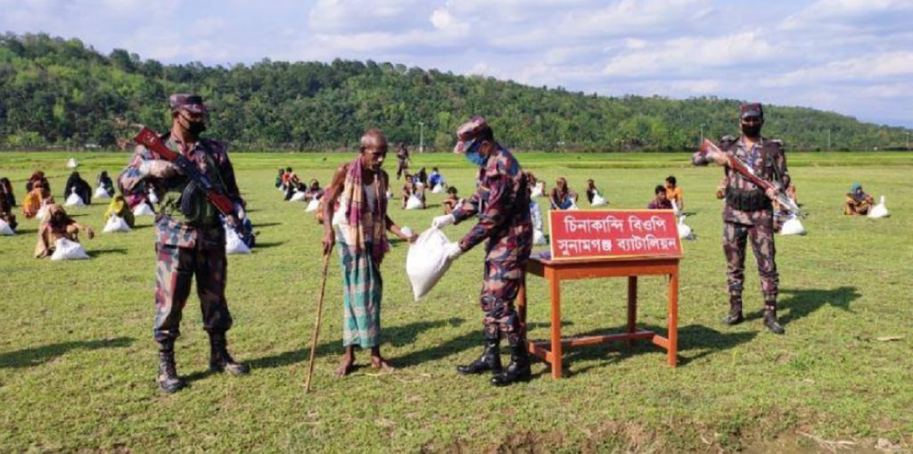 সুনামগঞ্জ-২৮ বিজিবির অধিনায়ক মো. মাকসুদুল আলম জানান, বৃহস্পতিবার ৩’শ পরিবারকে চাল, আটা, ছোলা, লবণ ও তেলসহ খাদ্য সামগ্রী দেয়া হয়েছে।