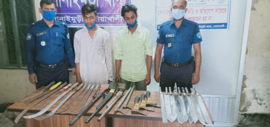নোয়াখালীর সোনাইমুড়ী থেকে ২৭ টি দেশীয় অস্ত্রসহ দুজনকে আটক করেছে পুলিশ। শুক্রবার রাতে গোপন সংবাদের ভিত্তিতে উপজেলার ২নং নদোনা ইউনিয়েন উত্তর শাকতলা থেকে বিভিন্ন মামলার আসামী জাবেদ ও মোঃ সাব্বিরকে গ্রেফতার করে পুলিশ।