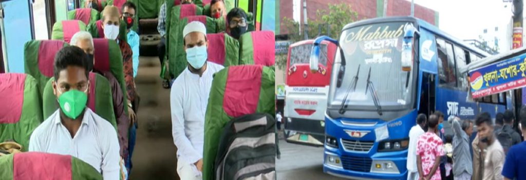 এদিকে রাজশাহীতে প্রথম দিনে যাত্রীদের চাপ চোখে পড়ার মতো। কিন্তু শারীরিক দূরত্ব ও স্বাস্থ্যবিধি মানার ব্যাপরে উদাসীন বাস কর্তৃপক্ষ ও যাত্রী উভয়েই; নেই প্রশাসনের তৎপরতাও। একই অবস্থা খুলনাতেও। জীবাণুনাশক স্প্রে করার ব্যাপারে রয়েছে গাফিলতি। মানা হচ্ছে না শারীরিক দূরত্ব। এক সিট পরপর বসার নির্দেশনা দেয়া হলেও একই পরিবার হওয়ায় পাশাপাশি বসছেন অনেকেই। প্রশাসনের নজরদারি না থাকায় স্বাস্থ্যবিধি ইস্যুতে রয়েছে অসচেতনতা।