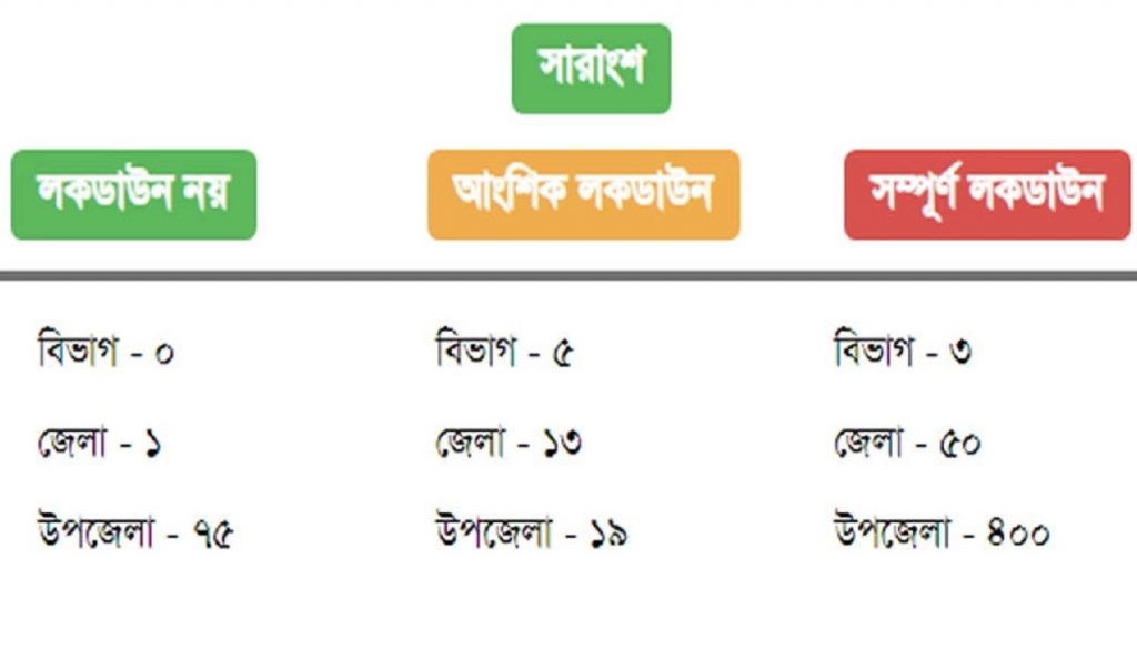 করোনার আপডেট সংক্রান্ত সরকারি ওয়েবসাইটে দেশের তিনটি বিভাগের ৫০টি জেলা ও ৪০০টি উপজেলাকে পুরোপুরি লকডাউনের তালিকায় (রেড জোন বিবেচিত) দেখানো হয়েছে। আংশিক লকডাউন (ইয়েলো জোন বিবেচিত) দেখানো হয়েছে পাঁচটি বিভাগ, ১৩টি জেলা ও ১৯টি উপজেলাকে। আর লকডাউন নয় (গ্রিন জোন বিবেচিত) এমন জেলা দেখানো হচ্ছে একটি এবং উপজেলা দেখানো হচ্ছে ৭৫টি। তবে সরকারি ওয়েবসাইটে তালিকা দেয়া হলেও এ বিষয়ে কোনো ধরনের আনুষ্ঠানিক ঘোষণা দেয়া হয়নি।