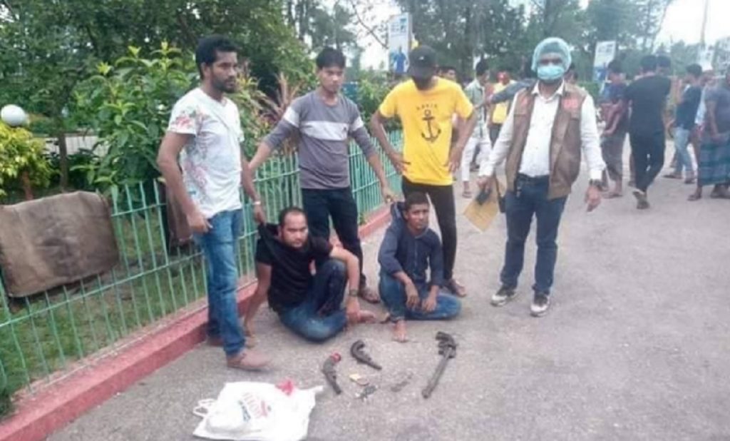 স্থানীয় সূত্রে জানা যায়, সকাল থেকে দফায় দফায় ওই এলাকায় কয়েকটি গ্রুপে বিভক্ত হয়ে মহড়া দিচ্ছিলো তারা। পরে স্থানীয়দের বিষয়টি সন্দেহ হলে মোটরসাইকেল আরোহী ওই দুই যুবককে আটক করে। পরে তাদের কাছে থাকা একটি হাত ব্যাগ কেড়ে নেয় স্থানীয় লোকজন। ওই হাত ব্যাগ খুলে দেখা যায় ব্যাগে তিনটি দেশীয় তৈরি এলজি। তারপর দুইজনকে আটক করে জেলা গোয়েন্দা পুলিশে সোপর্দ করা হয়।
