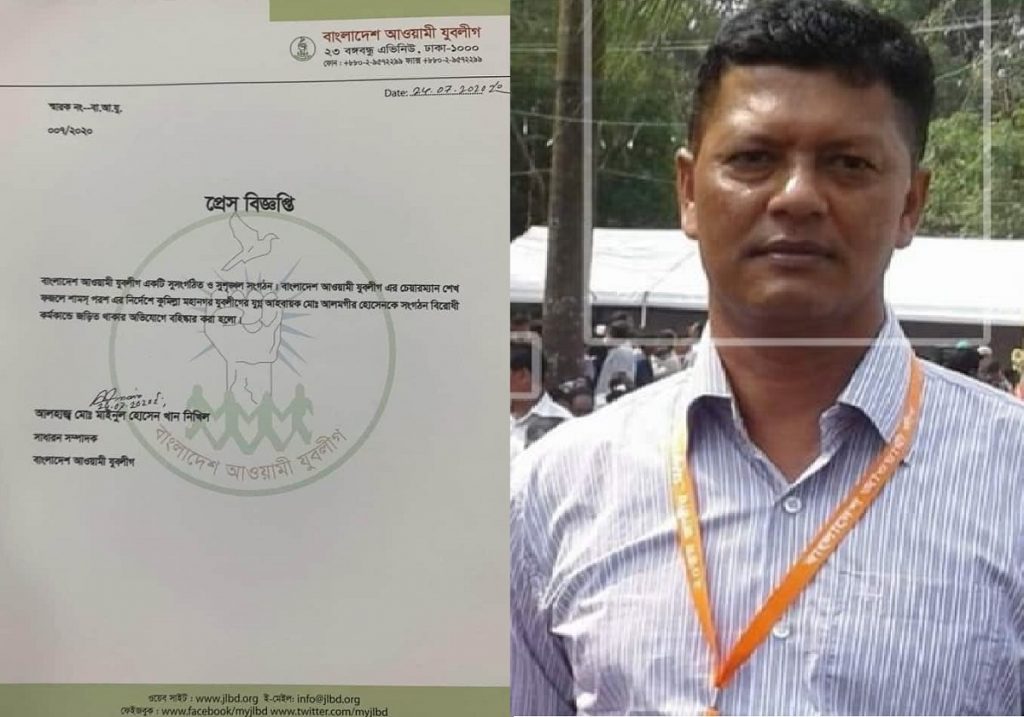 বিজ্ঞপ্তিতে বলা হয়, আওয়ামী যুবলীগ একটি সুসংগঠিত ও সুশৃংখল সংগঠন। সংগঠনটির চেয়ারম্যান শেখ ফজলে শামস পরশের নির্দেশে কুমিল্লা মহানগর যুবলীগের যুগ্ম আহবায়ক মো: আলমগীর হোসেনকে সংগঠনের শৃংখলা বিরোধী কর্মকান্ডে জড়িত থাকার অভিযোগে বহিষ্কার করা হলো।