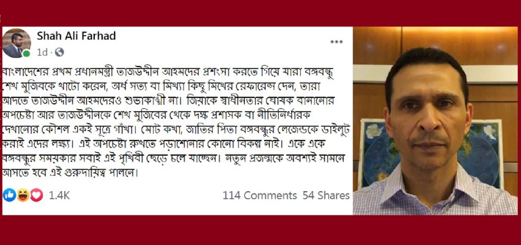 উল্লেখ্য, ২৩ জুলাই বাংলাদেশের প্রথম প্রধানমন্ত্রী তাজউদ্দীন আহমদের ৯৫ তম জন্মদিন উপলক্ষে ‘সিতারা’ (সেন্টার ফর তাজউদ্দীন আহমদ রিসার্চ এন্ড এক্টিভিজম) এর উদ্যোগে অনুষ্ঠিত ভার্চুয়াল আলোচনা সভায় তাজউদ্দীনের অবদানকে মহিমান্বিত করতে বঙ্গবন্ধুকে খাটো করা হয়েছে বলে অভিযোগ তোলেন প্রধানমন্ত্রীর বিশেষ সহকারি শাহ আলি ফরহাদ।