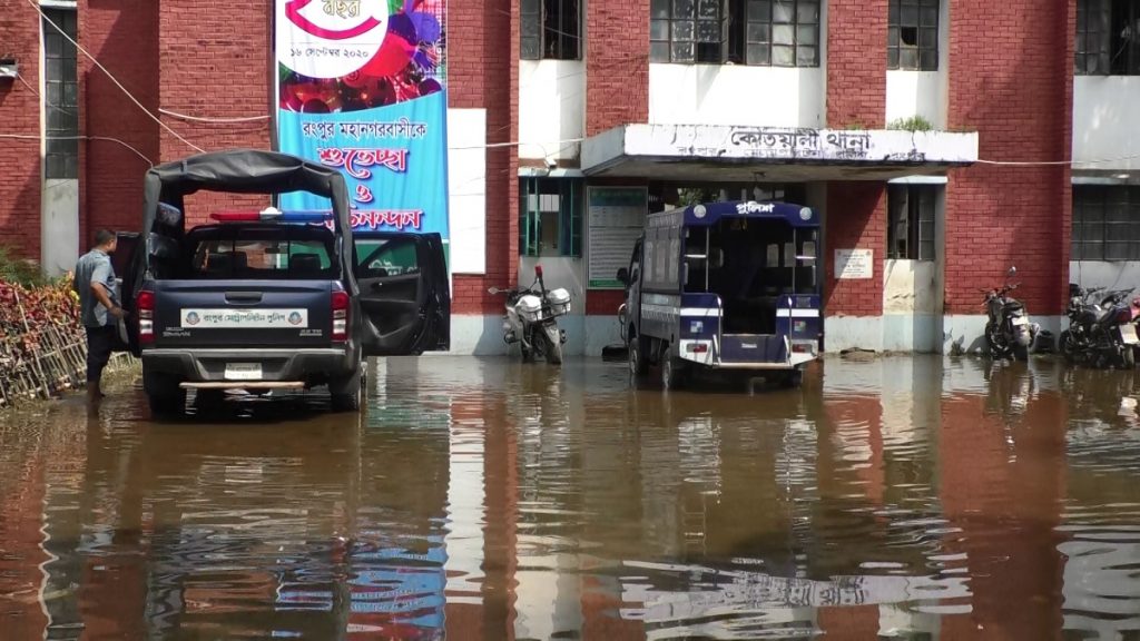 এখনও নগরীর প্রাণকেন্দ্র রংপুর মেট্রোপলিটন কোতোয়ালী থানা ও সামনের সড়কে হাটু পানি।থানা এলাকায় এখনও স্বাভাবিক হয়নি বিদ্যুৎ সরবরাহ। গাছ উপড়ে যাওয়ায় লাইন ঠিক করতে দেরি হচ্ছে বলে জানিয়েছে বিদ্যুৎ বিভাগ। আর থানার কার্যক্রম পরিচালনা করা হচ্ছে অন্য থানা ও সার্ভিস ডেলিভারি সেন্টার থেকে বলে জানিয়েছেন পুলিশ কমিশনার আব্দুল আলীম মাহমুদ।