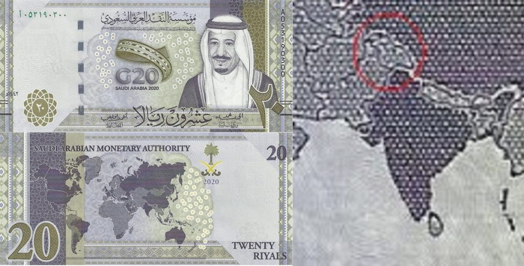 সম্প্রতি বিশ্বের অর্থনৈতিকভাবে শক্তিশালী ২০ দেশের সংগঠন জি-২০’র রিয়াদ সম্মেলনকে কেন্দ্র করে ছাপানো নতুন ২০ রিয়ালের মুদ্রার পিছন দিকে একটি বিশ্ব মানচিত্রের ছবি ছাপা হয়েছে। সেখানে পাক শাসিত কাশ্মির ও গিলগিট বালতিস্তানকে পাকিস্তানের মানচিত্র থেকে আলাদা করে একটি অন্য দেশ হিসেবে দেখানো হয়েছে। খবর হিন্দুস্তান টাইসম’র।