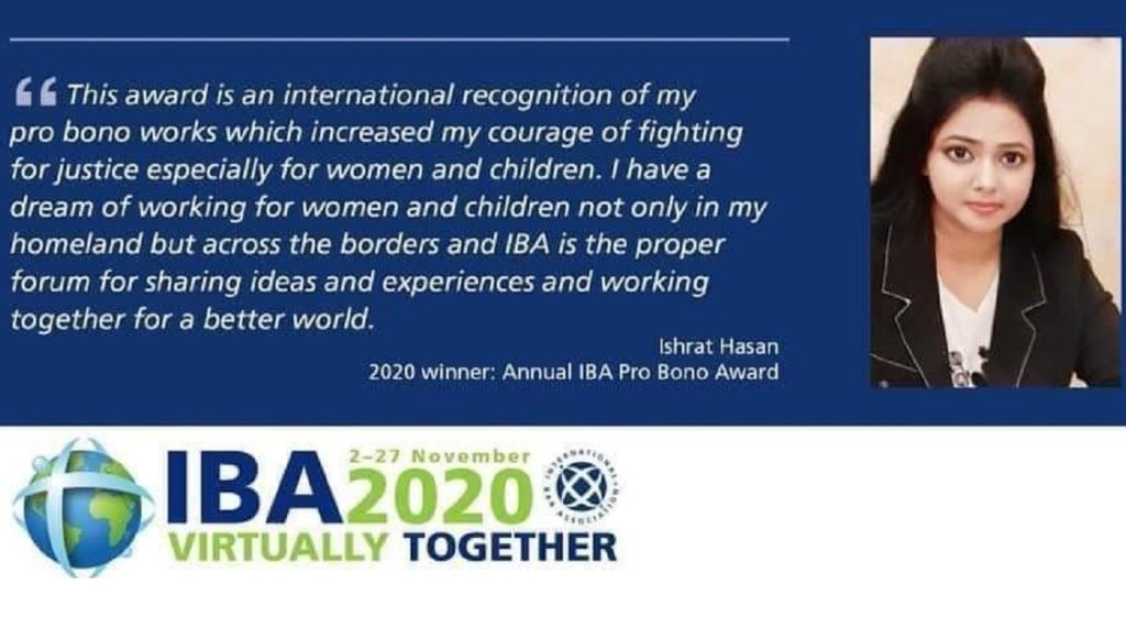 বাংলাদেশ সুপ্রিম কোর্টের খ্যাতিমান আইনজীবী ও মানবাধিকার কর্মৗ ইশরাত হাসান আন্তর্জাতিক বার অ্যাসোসিয়েশন কর্তৃক প্রদত্ত আইবিএ প্রোবোনো এওয়ার্ড, ২০২০ পেয়েছেন। আন্তর্জাতিক বার অ্যাসোসিয়েশনের কনফারেন্সে এই ঘোষণা দেয়া হয়।