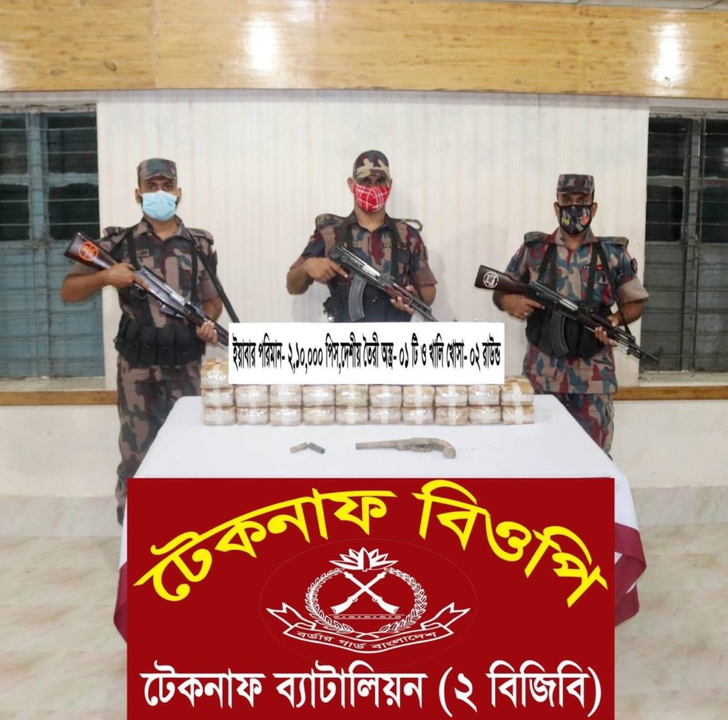 ঘটনাস্থল থেকে দুই লাখ ১০ হাজার পিস ইয়াবা, একটি আগ্নেয়াস্ত্র, তিন রাউন্ড গুলি উদ্ধার করা হয়েছে।