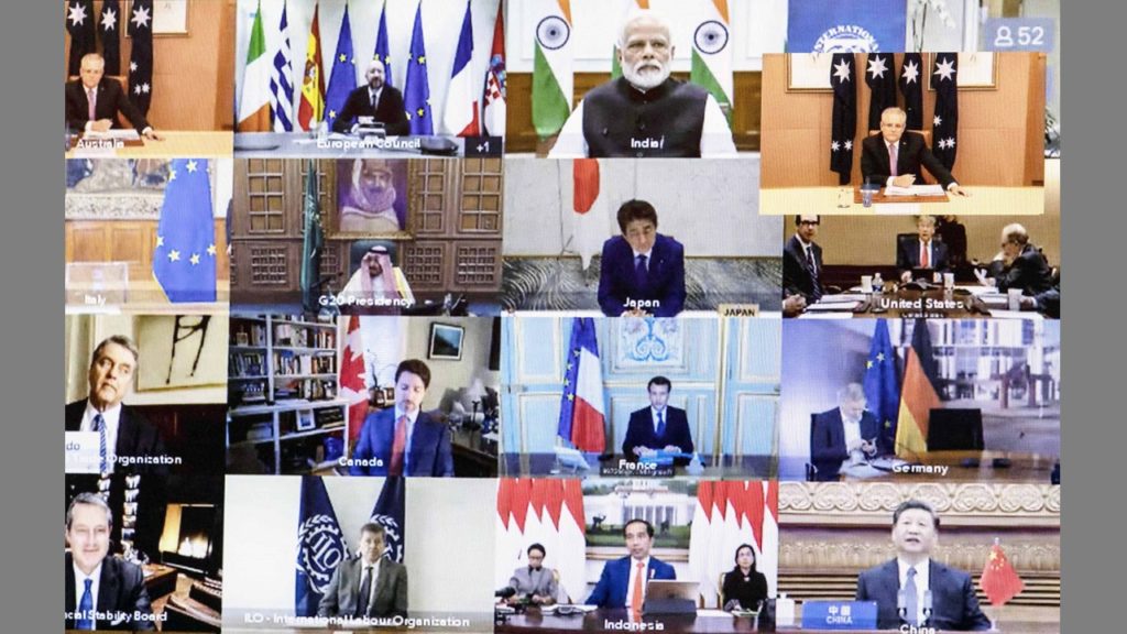 মহামারি পরিস্থিতির কারণে শনিবার রিয়াদে বাদশাহ সালমানের সাথে আয়োজনে ভার্চুয়ালি যোগ দেন অন্যান্য রাষ্ট্রনেতারা। এতে মহামারি পরবর্তী সময়ে বৈশ্বিক শাসনব্যবস্থা এবং একীভূত উন্নয়ন প্রচেষ্টার ওপর জোর দেন চীনা প্রেসিডেন্ট শি জিনপিং।